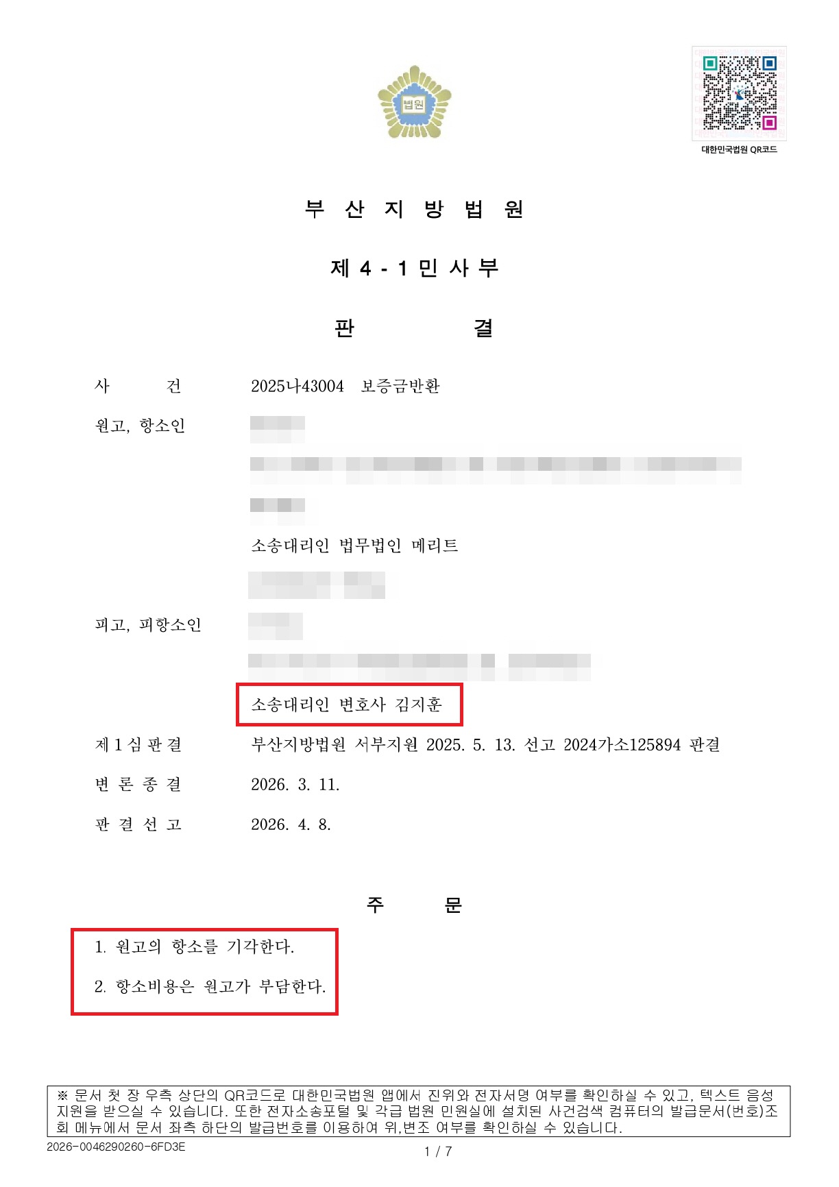 안녕하세요.법률사무소 중명 대표변호사 김지훈입니다.사업을 하다 보면 지인이나 친척의 부탁으로 부득이하게 사업자등록상 '명의'만 빌려주는 경우가 종종 발생합니다. 하지만 명의대여는 추후 예상치 못한 거액의 민사 소송으로 이어질 수 있어 각별한 주의가 필요합니다.오늘은 저희 사무실에서 피고(명의대여자)를 대리하여 1심에 이어 항소심(2심)에서도 원고의 2,000만 원 보증금 반환 청구를 완벽하게 방어해 낸 승소 사례를 소개해 드립니다.사건의 개요사건명: 보증금반환 (부산지방법원 항소심)원고(항소인): 상조상품 영업 지점 계약자피고(피항소인): 사업자등록상 명의상 대표 (본 법인 의뢰인)청구 금액: 2,000,0000원 및 지연손해금 원고는 피고의 명의로 등록된 '장례문화원'과 지점 협약을 체결하고 보증금 2,000만 원을 지급했습니다. 이후 원고는 사업장 폐업 및 양도 등을 이유로 피고에게 계약 해지에 따른 보증금 전액(2,000만 원)의 반환을 청구하는 소송을 제기했습니다. 1심에서 패소한 원고는 이에 불복하여 항소심을 제기하였습니다.사건의 핵심은① 피고가 실질적인 계약 당사자인가(명의대여의 효력),② 실질적인 반환 의무가 남아있는가였습니다.본 변호사는 아래와 같은 사실관계를 치밀하게 입증하며 재판부를 설득했습니다.1. "의뢰인은 형식적인 명의대여자에 불과합니다."(당사자 특정의 문제)원고는 피고가 아닌 실제 운영자와 지속적으로 업무 연락을 취하고 지점 협약서 역시 실제 운영자와 작성했음을 카카오톡 메시지 및 회원증서 등 객관적 증거를 통해 입증했습니다.당시 93년생이었던 피고의 직함이 '대리'에 불과했던 점을 강조하여, 원고 역시 피고를 실제 운영자로 믿지 않았음을 적극 주장했습니다.2. "보증금에서 공제해야 할 '선할인금액'이 훨씬 더 큽니다."(상계 및 공제 주장)해당 보증금은 원고의 장례행사 선할인금액 충당을 위한 담보 목적이었습니다.본 변호사는 원고가 실제 상품금액의 10%를 대납하지 않은 정황을 짚어내고, 항소심 변론종결일 기준 원고의 선할인금액이 26,780,000원에 달함을 명확히 계산하여 재판부에 제시했습니다.법원의 판단 (부산지방법원)재판부는 피고의 주장을 모두 받아들여 원고의 항소를 기각하고, 피고 전부 승소 판결을 내렸습니다.계약 당사자 불인정: 이 사건 지점계약의 실질적 당사자는 명의상 대표인 피고가 아니라고 판단하여 피고의 채무불이행 주장을 배척했습니다.반환할 보증금 부존재: 설령 보증금 반환 의무가 있다고 가정하더라도, 피고가 공제해야 할 선할인금액(약 2,678만 원)이 보증금(2,000만 원)을 초과하므로 반환할 금액이 남아있지 않다고 판시했습니다.승소의 의의 및 조언본 사건은 계약서상의 명의자가 누구인지도 중요하지만, '실질적인 계약의 당사자가 누구인지'를 꼼꼼한 증거 수집을 통해 입증해 낸 성공적인 사례입니다. 또한, 무작정 보증금 반환 의무를 부정하는 것에 그치지 않고, 예비적으로 공제되어야 할 정산 금액(선할인금액)을 역산하여 반환 의무 자체를 소멸시킨 전략이 주효했습니다.명의대여로 인해 억울하게 소송에 휘말리셨거나, 복잡한 정산금이 얽힌 계약 분쟁으로 고충을 겪고 계시다면 초기부터 명확한 논리로 대응하는 것이 중요합니다. 부산 지역의 복잡한 민사 분쟁, 법률사무소 중명이 든든한 방패가 되어드리겠습니다.예약문의 법률사무소 중명부산 해운대구 센텀중앙로 78, 1707호051)917-6595감사합니다.